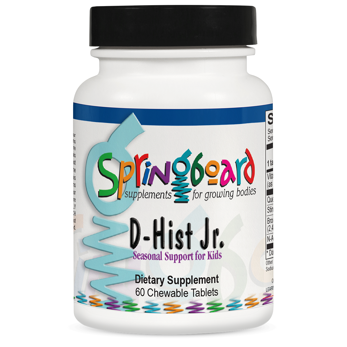 D-Hist Jr.™ is a great-tasting, chewable tablet that includes a targeted blend of flavonoids, antioxidants, proteolytic enzymes and botanicals designed to provide comprehensive support for children with seasonal challenges caused by common environmental allergens. D-Hist Jr.™ includes quercetin, a powerful flavonoid to support healthy histamine levels. It supplies bromelain to enhance the absorption of quercetin and to support mucosal tissue health and stinging nettles leaf to balance hyper-immune response. N-acetyl cysteine clears the airways by promoting normal viscosity of mucus. This unique nutritional combination safely promotes healthy nasal and sinus passages for children with elevated histamine and respiratory irritation.